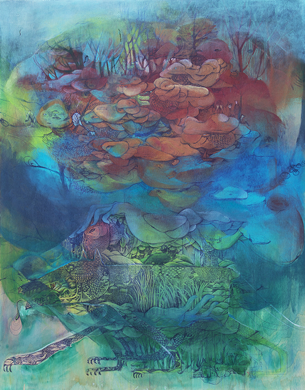 Now as an adult, not having achieved the status of former child genius, Lan still has her friends with her as her mind roams in a space full of wonder. Lan paints landscapes, inspired often by hikes through the coastal rainforest of Squamish, BC. Her friends, the creatures of her childhood, now live in these spaces, safe, free and always at play.