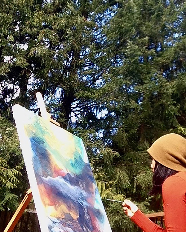 Now as an adult, not having achieved the status of former child genius, Lan still has her friends with her as her mind roams in a space full of wonder. Lan paints landscapes, inspired often by hikes through the coastal rainforest of Squamish, BC. Her friends, the creatures of her childhood, now live in these spaces, safe, free and always at play.